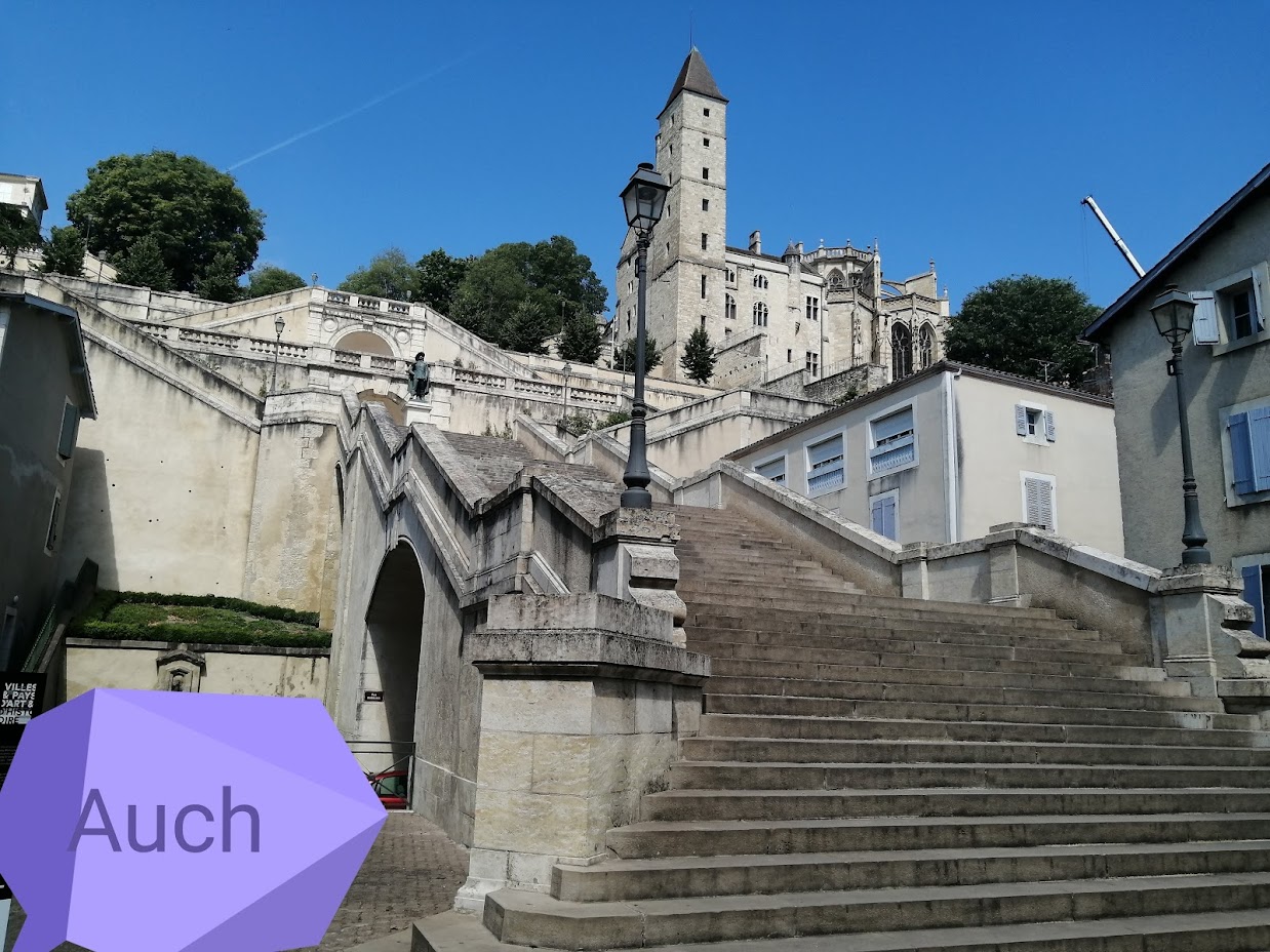 Auch, petite capitale du Gers en Occitanie, est perchée sur les coteaux de la Gascogne, dominée par sa majestueuse cathédrale Sainte-Marie. Cette ville de caractère, riche d'une histoire médiévale bien préservée, offre une atmosphère authentique typique du sud-ouest français, où tradition et quiétude règnent en maître.